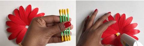 Step 3: Make a flower. Dip a cotton swab into yellow, cut out the end of the cotton swab, and stick it in the middle.