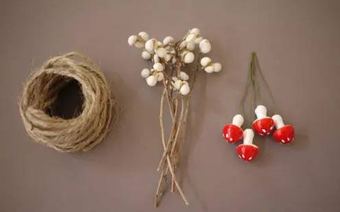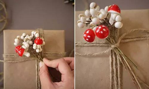 Wrap the gift in postal wrapping paper, wrap the hemp rope in the middle of the package, and cross-wrap it near one side, do this 2-3 times and keep the hemp ropes close to each other. After the final twist, tie the string into a double clasp on the front of the gift and tie a few small dried berry bouquets to it. Add one or two small mushrooms, isn’t it cute~