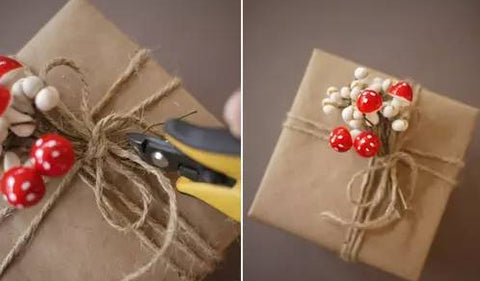 Wrap the gift in postal wrapping paper, wrap the hemp rope in the middle of the package, and cross-wrap it near one side, do this 2-3 times and keep the hemp ropes close to each other. After the final twist, tie the string into a double clasp on the front of the gift and tie a few small dried berry bouquets to it. Add one or two small mushrooms, isn’t it cute~