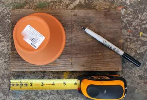 Materials: Scrap wood, terra cotta flower pot, wire rope, 3/8″ drill bit, paintbrush and paint, drill bit, metal ring