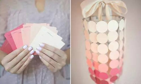 Get an old lampshade. And start making the card string, punch down the colored part, and then take a long string and paste it on the back of the card.