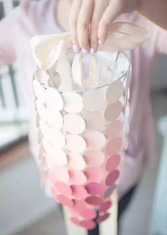 Pick a color you like. This time I chose some gradient colors with pink tones and used a hole punch to make them into a uniform shape. It will take about 40-60 sheets. The finished pieces of paper can be placed in different dishes.