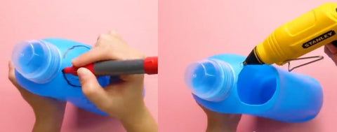 Materials and Tools: Laundry detergent bottle, plastic bottle, needle, lighter, marker, hot glue, scissors