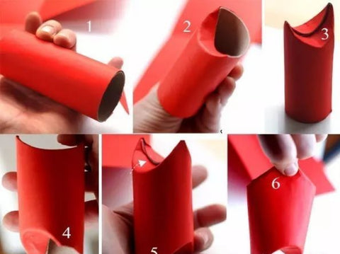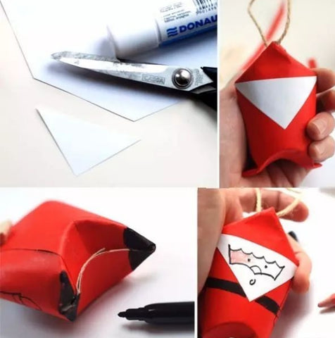 2. Fold the two ends of the paper roll as shown in the figure. Note that the folding directions of the two ends are cross. After folding, fix it with glue. Then glue the two sharp corners of one end of the paper tube together, and Santa’s body is completed.