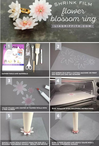 Materials and tools you need: heat shrink sheets, markers, ring pieces, small wooden sticks, all-purpose glue, heat gun or oven