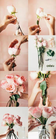 1. First we should deal with the roses. Cut off 1″ or 2″ off the bottom of the rhizome at a diagonal angle, remove all the leaves on the rhizome except for the top ones, and remove excess petals on the periphery.