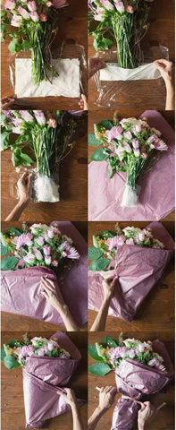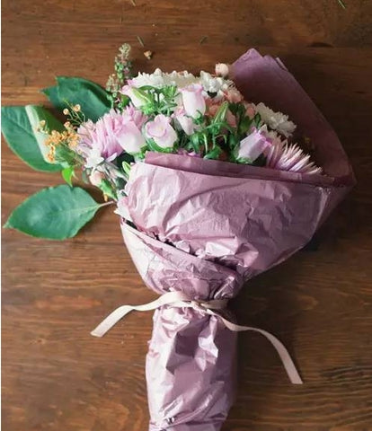 3. If you want to give the bouquet to a friend or take it to a dinner party, there is a simple wrapping method: put a piece of damp paper towel on the plastic wrap and wrap it at the bottom of the flower branch, and then wrap it with a layer of paper towel. Use the gift wrapping paper left over from before to wrap the bouquet. If the paper is wrinkled, it will look more attractive~