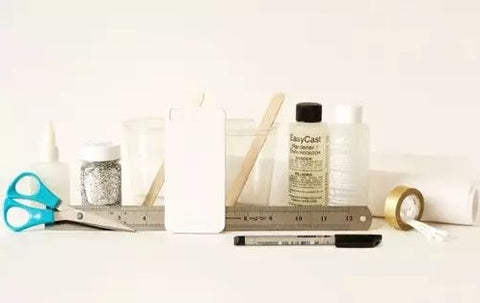Other things you’ll need are: white iPhone case, craft glue, work tablet, tape scissors, wax paper, ruler, small marker, timer, 2 clean plastic cups, two craft sticks with acetone Nail polish remover, cotton swabs, transparent resin