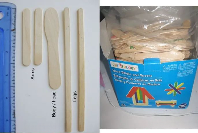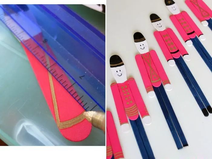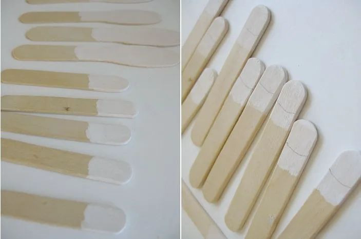 Materials: colored popsicle sticks, paint, white latex, utility knife, black oil-based pen, scissors